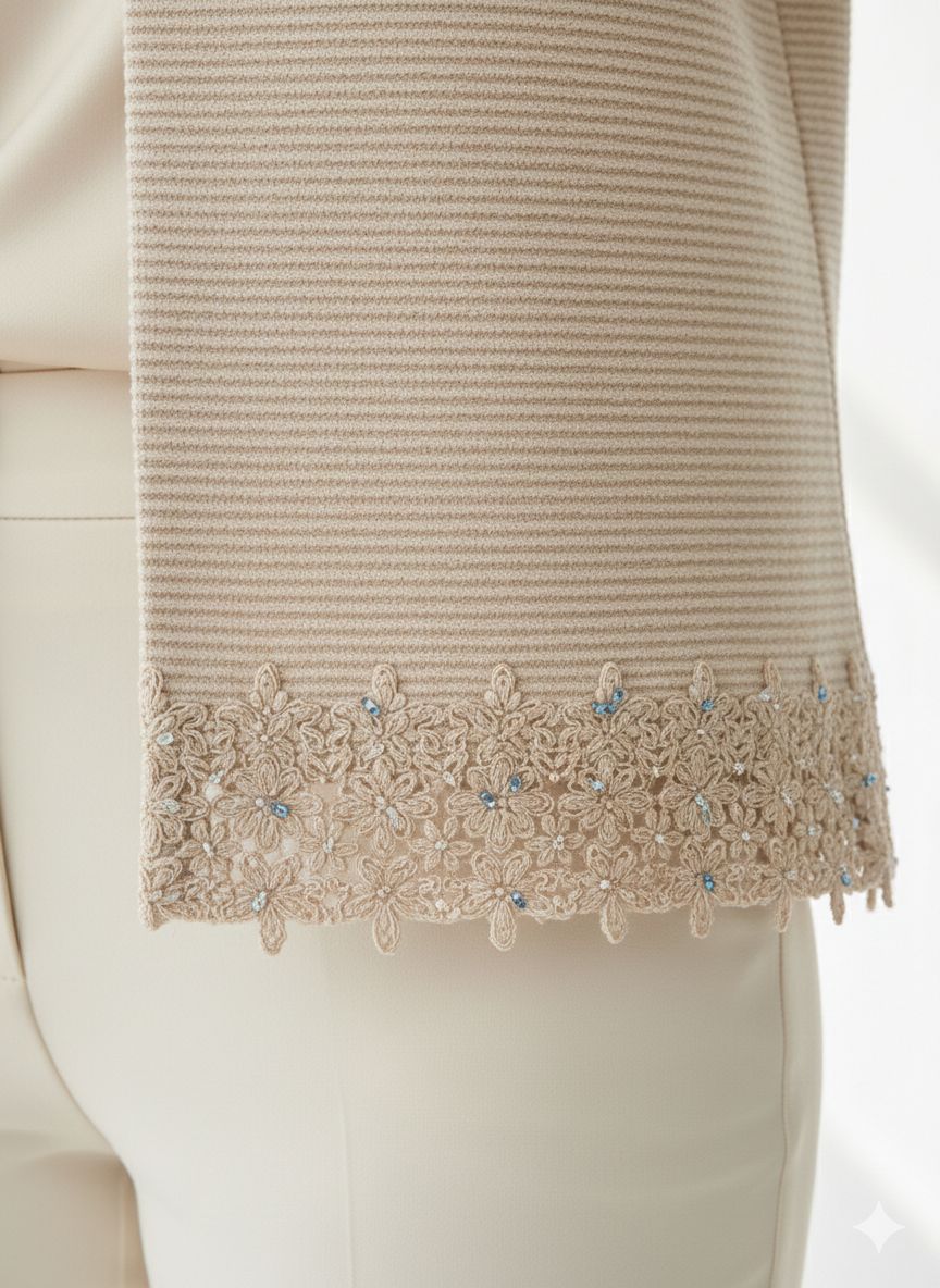 بافت کشمیری نرم و لطیف پایین کت با گیپور شیک نیمهمجلسی و تنخور عالی سبک، راحت و قابل ست با انواع استایل